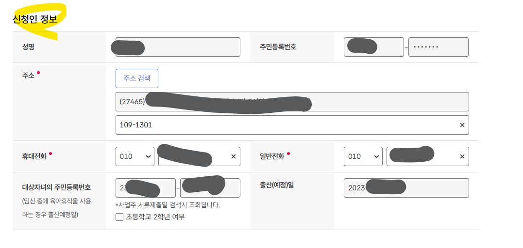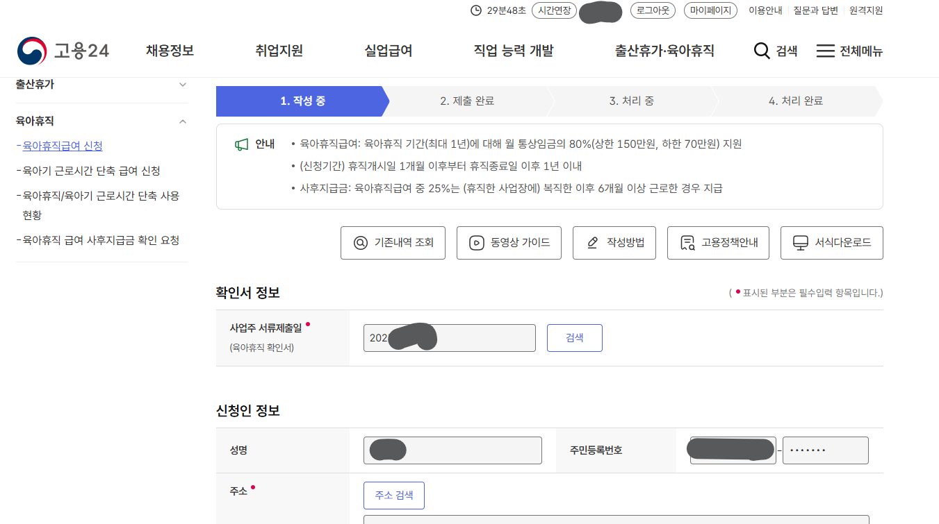 이것이 가장 중요한 단계인 것 같아요. 육아휴직은 나 혼자 신청한다고 되는 것이 아니라 회사에서 서류를 제출 해 줘야 신청이 가능합니다. 그래서 위에 '사업주 서류제출일'이 란이 채워져있어야만 합니다.