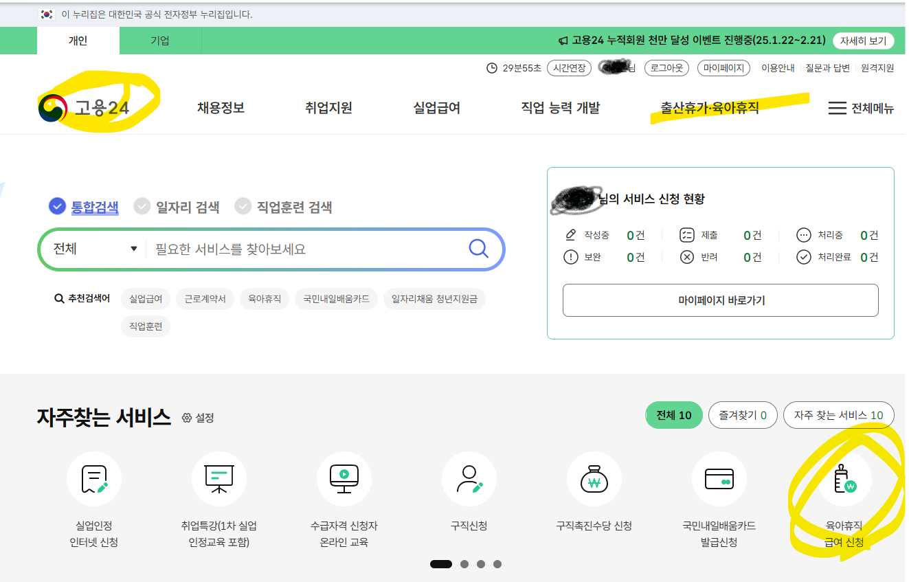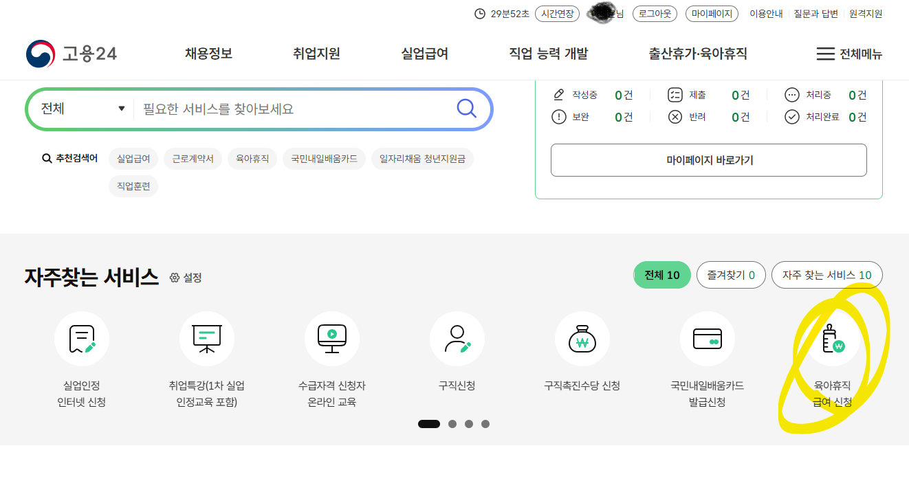 하단에 자주찾는서비스에 보면 '육아휴직 급여 신청'버튼이 보입니다. 이 버튼 눌러주시면 됩니다. 혹 보이지 않는다면 검색해서 들어가시거나 상단에 출산휴가육아휴직탭을 누르세요.