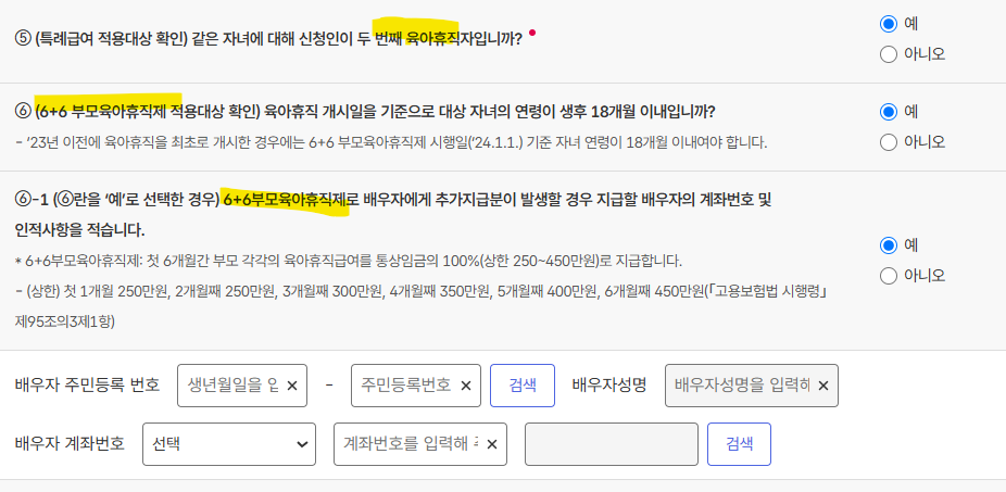 6+6육아휴직은 두번째로 더 늦게 육아휴직을 게시하는 부모가 신청 할 때 신청되는것이기에 더 늦게 신청하는 사람이 해당 부분에 '예'표시 해주시면 됩니다.
